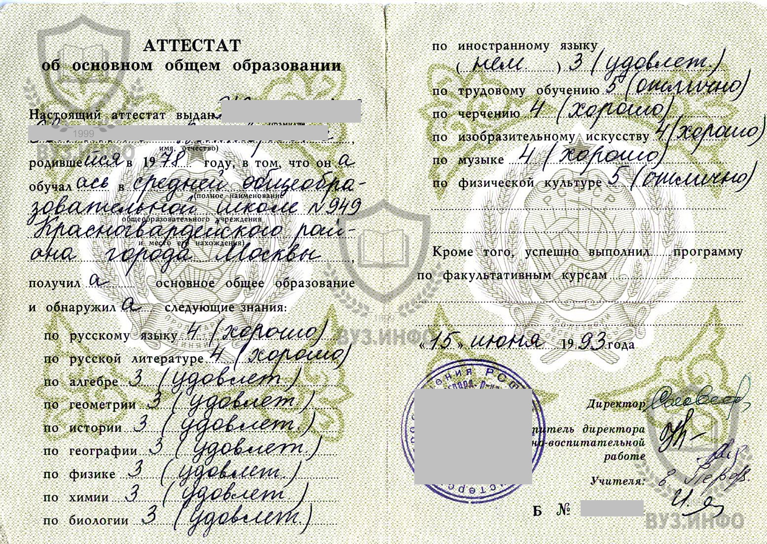 Аттестат за 9 (в советское время — 8) классов выдаётся при окончании школы в 15 лет. Это самая первая ступень образования в нашей стране. Если вы решили закончить школу в этом возрасте вы можете получить аттестат. Если вы не смогли официально доучиться до 9 класса, то можно купить аттестат за 9 классов в ВУЗ.ИНФО.