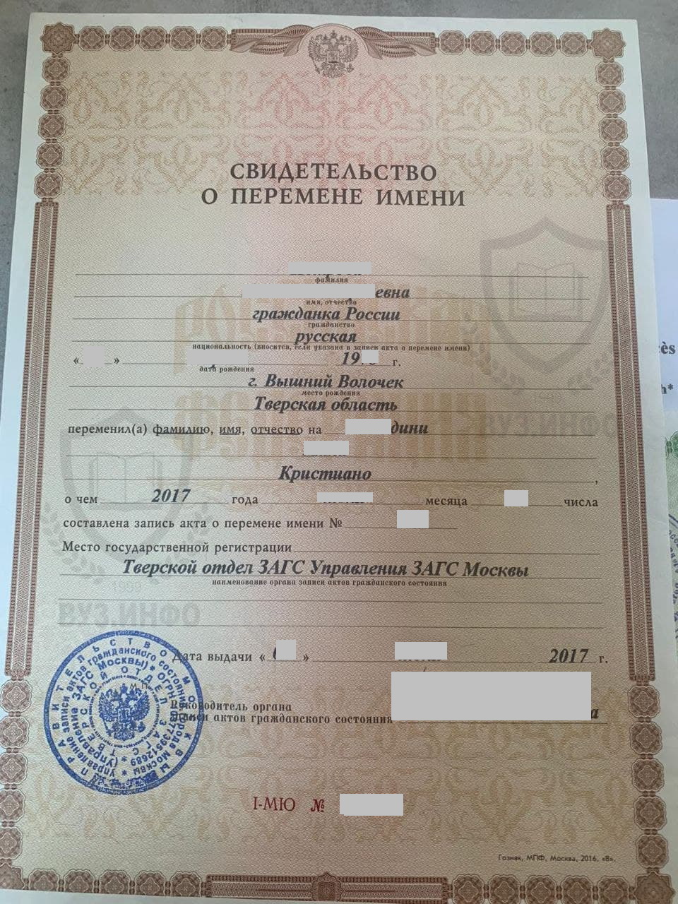 Если вы решили документально подтвердить смену фамилии и (или) имени и (или) отчества, то можно купить свидетельство ЗАГС о перемене имени. ВУЗ.ИНФО сделает этот документ в лучшем виде на настоящем бланке.